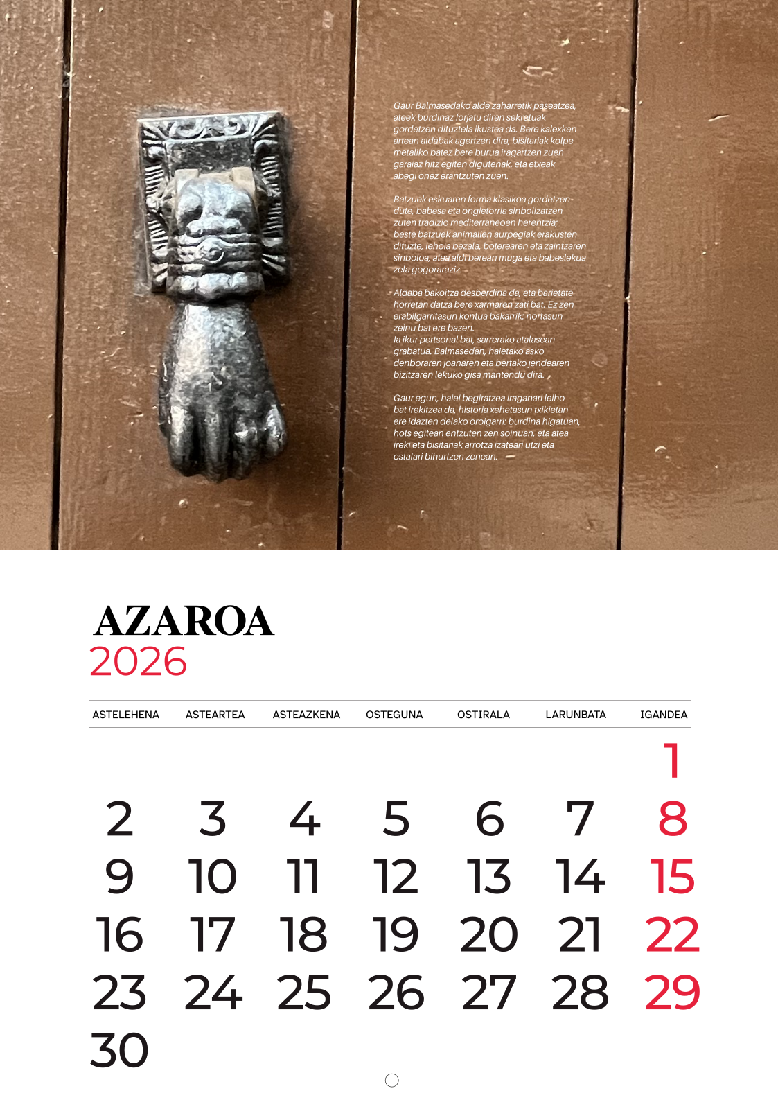 Este año nuestra serie #viviendobalmaseda2026, añade una versión en euskera: #barrutikbalmaseda. Un calendario pensado para el txoko familiar, para la nevera de tu cocina, para tu negocio… en definitiva, para quienes llevan a Balmaseda en el corazón, sea dónde sea. Cada mes incluye una fotografía de la villa acompañada de una curiosidad o dato sobre ella, el detalle o la anécdota detrás de la imagen; una manera de redescubrir nuestro pueblo a través de rincones que a lo mejor desconoces.