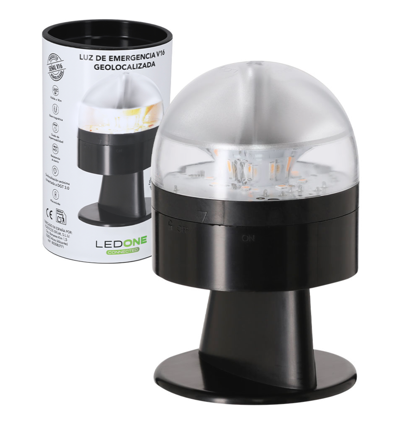 Luz de emergencia V16 Geolocalizada para vehículos, fabricada con materiales reciclados. Conforme a la normativa de seguridad vigente y homologada por laboratorio acreditado LCOE, según requisitos de la DGT , con número de homologación marcado en la parte superior del artículo. Incluye tarjeta SIM conectada con Vodafone, con servicio de comunicación de datos hasta ENERO 2038, sin gastos ni cuotas adicionales. De activación manual y con base de fijación magnética. Resistencia al viento de hasta 180Pa, visibilidad 360° -hasta 1 km de distancia- y resistencia al agua conforme a estándares IP54. De tamaño compacto para guardar en cualquier compartimento del vehículo y tenerla a mano en caso de emergencia. Presentada en caja individual de diseño. Manual incluido (español e inglés). Alimentación a pilas (1x9V 6LR61 batería incluida), con una autonomía de 2.5 horas.
